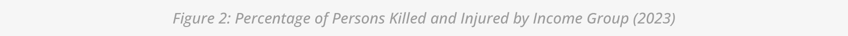 When road safety data are viewed through the lens of income, clear structural disparities emerge. High– and upper middle-income regions together report the largest share of global road fatalities and injuries (Figure 2). Among these, high–income countries report a substantial majority of injuries but a relatively small share of fatalities, suggesting that better road infrastructure, safer vehicles and stronger emergency care systems may help reduce fatal outcomes. In contrast, upper middle-income countries show the highest fatality rates relative to injuries, indicating that while motorisation levels are rising, safety systems and enforcement mechanisms have not yet caught up. Lower–income regions report the fewest fatalities and injuries, a figure that likely understates the real situation due to persistent underreporting and weaker institutional capacity to collect reliable data.